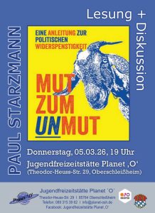 Oberschleißheim – Am Donnerstag, den 05. März 2026, um 19:00 liest der Berliner Journalist Paul Starzmann aus seinem Buch „Mut zum Unmut – eine Anleitung zur politischen Widerspenstigkeit“. Im Anschluss diskutiert er gemeinsam mit der Aktivistin Lisa Poettinger in der Jugendfreizeitstätte Planet ,O‘.